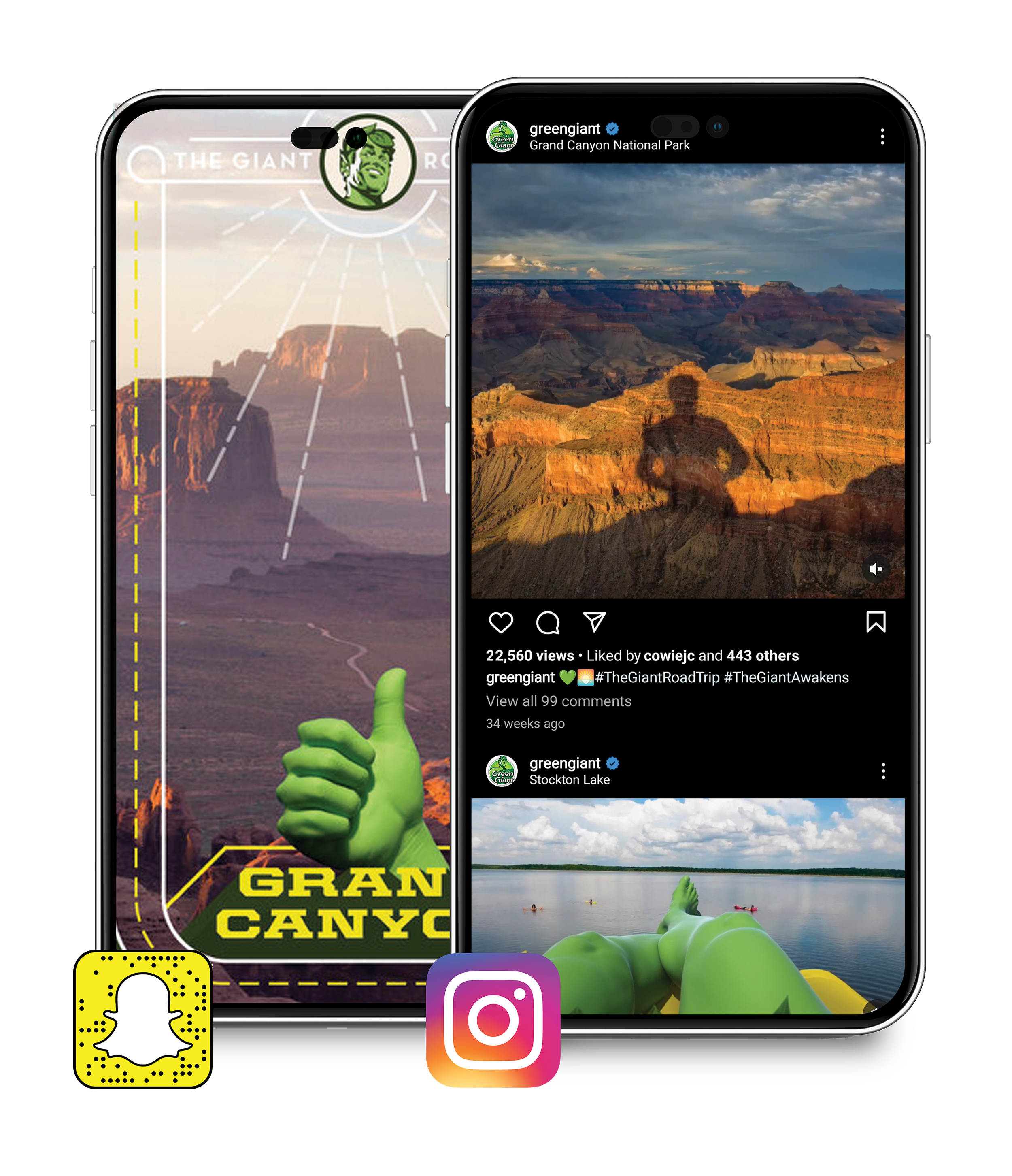 After years out of the spotlight, it was time to wake up one of America's favorite brands. Teasing the Green Giant’s comeback started with an epic film and led to a cross-country journey for the big guy and his little buddy, Sprout. Each of them documented their trek across America on their own FB and IG accounts. We created dozens of posts showing their different perspectives at familiar landmarks and some less familiar (but very real) monuments. The world’s largest fork, largest rocking chair, largest boots — all the ”world’s largest” objects got custom, geofenced Snapchat filters along the way.